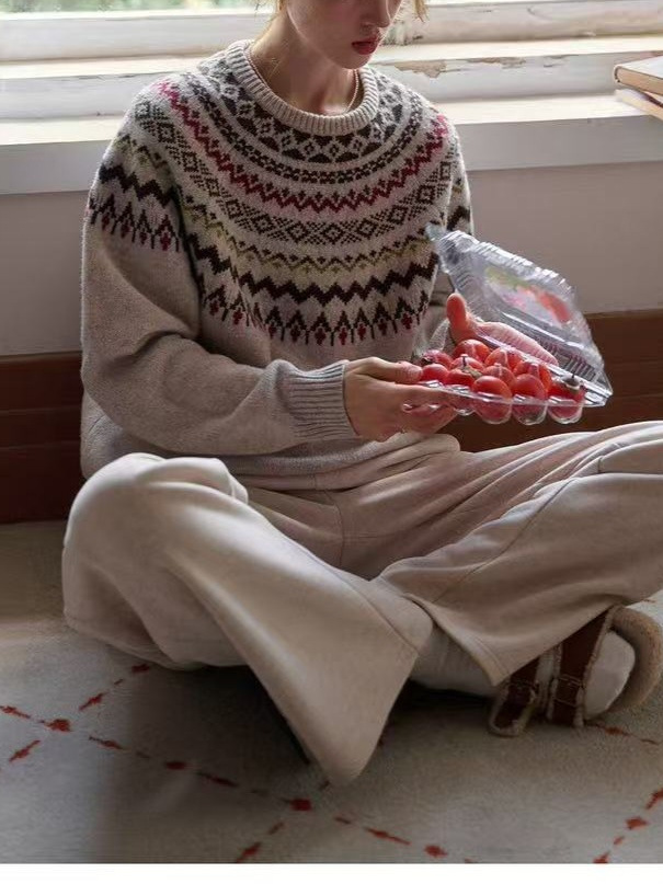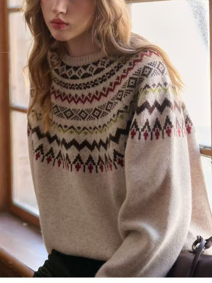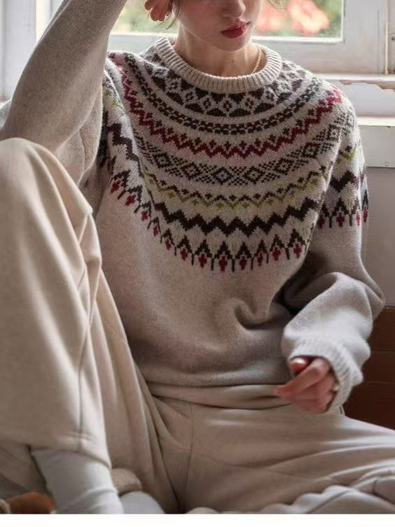 • Women's Lazy, Soft and Cozy Fair Isle Wool Crew Neck Jacquard Knitted Sweater